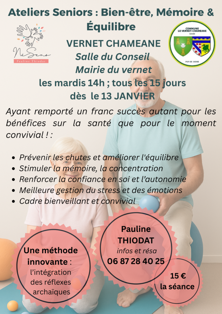 Les séances innovantes autour des réflexes archaïques, dans deux communes à COUDES et au VERNET CHAMEANE, ont rencontré un franc succès autant pour les bienfaits sur la santé que les moments de convivialité !
